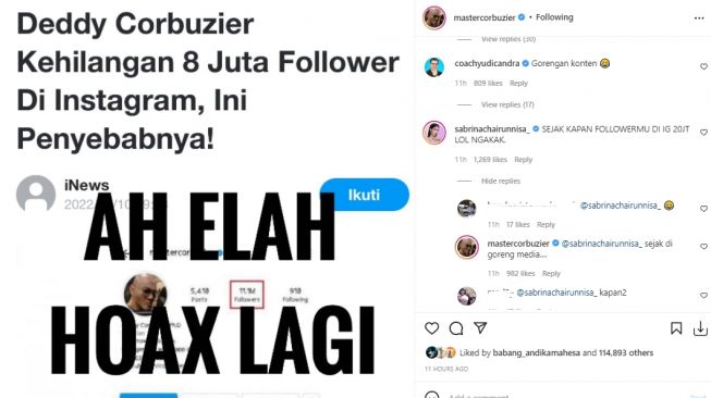 Deddy Corbuzier membantah bahwa ia kehilangan 8 juta followers Instagram. Ia pun melabeli sebuah pemberitaan dengan label hoaks.